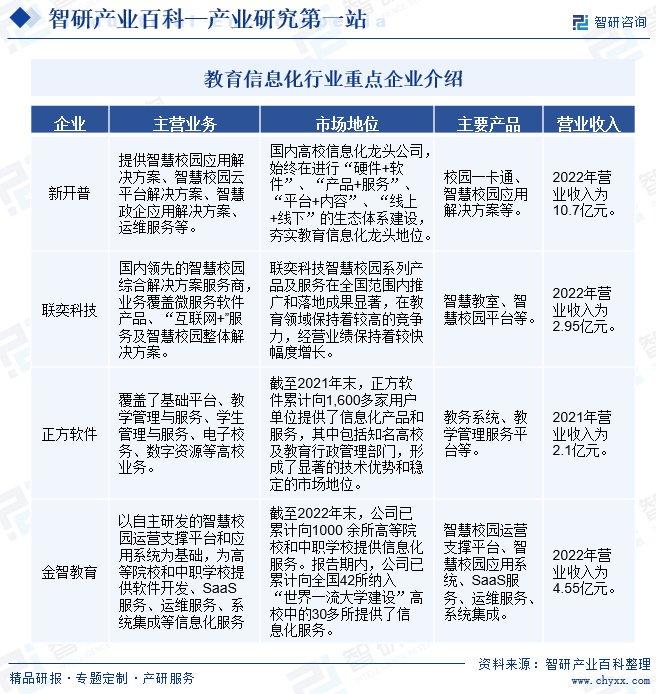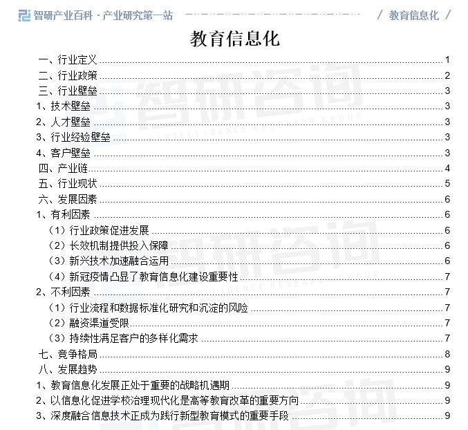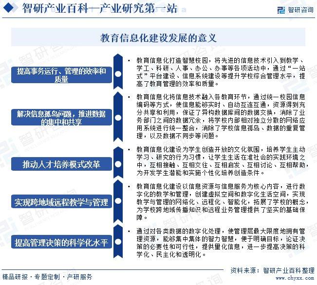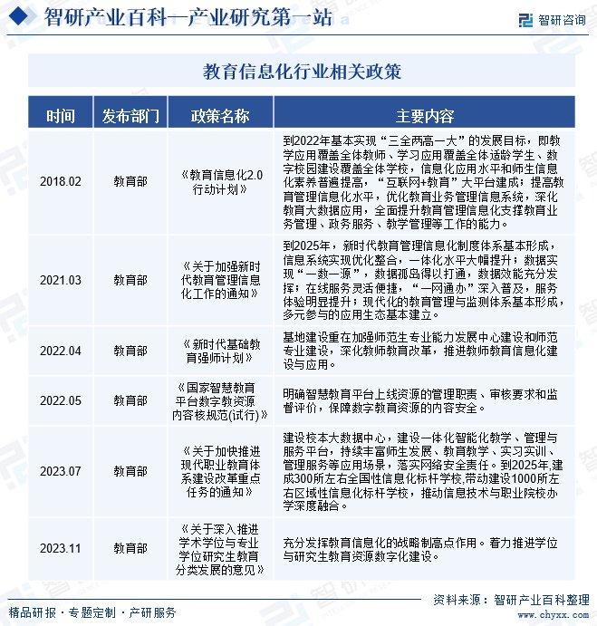 智研产业百科是智研咨询推出的产研工具平台,致力于为您提供全方位的百科式产业信息查询服务。智研咨询践行用信息驱动产业发展的企业使命,完善和丰富企业方法论,依托产业百科平台提升信息价值,持续为行业发展及企业投资决策赋能。教育信息化产业百科作为教育信息化产业一站式系统化研究工具,全面归纳了教育信息化产业知识信息,内容涵盖教育信息化产业的定义、分类、政策、产业链、竞争格局、发展趋势等,并依靠信息技术建立智能互链的行业知识图谱,为行研从业者及相关投资者提供深入的洞察力和全面的信息。