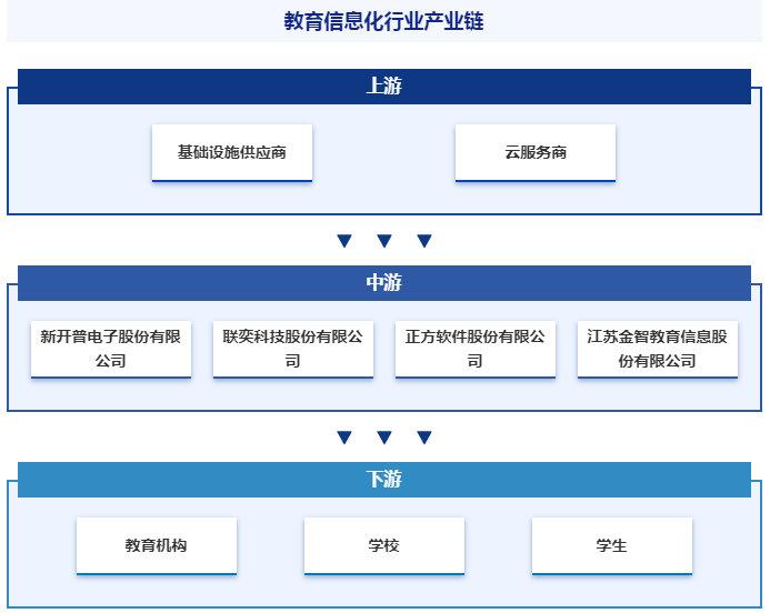 进入教育信息化2.0时代,我国教育信息化形成了新的产业链格局,上游主要由基础设施供应商、云服务商和大型软件企业等构成,其提供硬件和云资源基础设施,以及中间件支撑软件产品,该等企业实力较强,行业集中度较高;中游主要为数字资源与平台开发服务商,包括支撑平台和管理应用类软件,以及教学数字资源,市场较为分散,参与企业较多;下游主要为学校及师生。