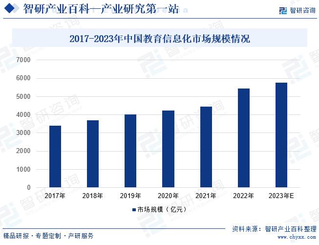摘要:教育信息化向全链接、全感知、全智能的智慧化校园建设方向不断深化,市场规模也在逐年攀升,2017至2023年我国教育信息化行业市场规模由3405亿元增至5431亿元,年复合增长率达9.79%,2023年将达到5776亿元。