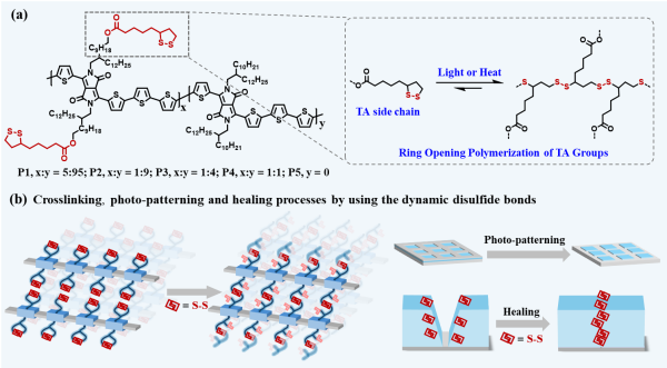 有机高分子半导体的高分辨率精确图案化是构建有机电路的关键技术之一,通过图案化可以减少单元器件之间的干扰并提升器件稳定性。与此同时,修复特性能够有效解决有机高分子半导体因超出弹性极限而导致的机械变形、性能衰退问题,从而提升电子设备的可靠性和耐用性。将可图案化及可修复两种功能同时集成到有机高分子半导体中,有利于拓展有机高分子半导体在柔性电子器件中的应用前景。 有机高分子半导体的高分辨率精确图案化是构建有机电路的关键技术之一,通过图案化可以减少单元器件之间的干扰并提升器件稳定性。与此同时,修复特性能够有效解决有机高分子半导体因超出弹性极限而导致的机械变形、性能衰退问题,从而提升电子设备的可靠性和耐用性。将可图案化及可修复两种功能同时集成到有机高分子半导体中,有利于拓展有机高分子半导体在柔性电子器件中的应用前景。近日,中国科学院化学研究所张德清课题组在前期工作基础上,发展了兼具可图案化与可修复两种功能的有机高分子半导体。该策略利用硫辛酸基团的动态共价二硫键,实现将光图案化和热修复功能成功集成到一种基于吡咯并吡咯二酮的聚合物半导体中。研究结果表明,侧链中硫辛酸的引入比例对有机高分子半导体的迁移率有显著影响。当含有硫辛酸基团的侧链与纯烷基链的重复单元的摩尔比大于1:4时,其迁移率低于不含硫辛酸侧链的聚合物PDPP4T(聚吡咯并吡咯二酮-四噻吩)。因此,研究选用含有硫辛酸基团的侧链与纯烷基链的重复单元的摩尔比为1:4的聚合物P3,进行图案化和修复性能测试。实验表明,P3薄膜在365 nm紫外光照射下展现出优异的光图案化能力,其灵敏度和对比度分别达到210 mJ/cm2和1.2。值得注意的是,图案化过程对薄膜的形态、分子链堆积及电荷传输迁移率几乎没有影响。此外,划伤的图案化薄膜在暴露于氯仿蒸气并进行后续热退火后能够完全自愈,并且迁移率得以恢复。相比之下,侧链中不含硫辛酸基团的PDPP4T薄膜在相同条件下,仅恢复了82.6%的裂痕深度和54.5%的迁移率。相关研究成果发表在《德国应用化学》上。研究工作得到国家自然科学基金委、科技部和中国科学院的支持。论文链接(a)侧链带有硫辛酸基团的聚合物半导体(P1-P5)的结构式及硫辛酸基团的开环聚合反应示意图。(b)通过二硫键动态可逆的断裂和形成实现交联、图案化和修复过程的示意图。