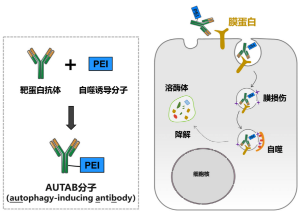 这一技术的灵感源于自然界中病原体感染和细胞膜损伤后细胞自主启动自噬进行清除的现象。该研究在筛选自噬诱导分子过程中发现,广泛应用于基因及药物递送的材料聚乙烯亚胺(PEI)能够高效诱导类似的细胞自噬。基于此,研究利用点击化学方法将聚乙烯亚胺与能够特异性识别目标膜蛋白的抗体共价连接,构建出既能精准定位又能有效激活自噬机制的AUTAB分子,实现了对细胞膜蛋白的靶向降解。