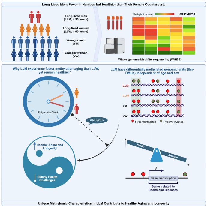 该研究从全基因组视角揭示了男性长寿人群存在大量特异DNA甲基化修饰且与肿瘤等重大老年疾病相关。这为男性长寿老人数量较少但健康状况更佳提供了科学解释,为剖析男性特异的健康老化分子调控机制提供了新证据。