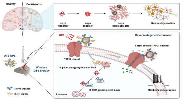 该团队设计了光热无线深部脑刺激纳米系统,并命名为ATB NPs。ATB NPs通过直接刺激神经元内源性表达的热敏TRPV1受体,实现对退化神经元的精准调控。ATB NPs由三个核心模块组成:光热转换模块(金纳米壳AuNSs),用于激活热敏TRPV1离子通道;靶向模块(TRPV1抗体),靶向高表达TRPV1受体的多巴胺能神经元;降解模块(β-syn多肽,含近红外响应连接体),通过结合α-syn的非淀粉样蛋白-β成分疏水结构域,降解α-syn纤维。研究显示,通过立体定位技术将ATB NPs注射至帕金森病小鼠的黑质后,ATB NPs借助TRPV1抗体锚定在多巴胺能神经元表面。在808 nm脉冲近红外激光照射下,ATB NPs作为纳米天线进行光热转换,激活热敏TRPV1受体,引起Ca2+内流和动作电位产生。同时,ATB NPs释放β-syn多肽,并通过激活分子伴侣介导的自噬途径,清除α-syn聚集体,减少病理性纤维。研究发现,ATB NPs能够恢复多巴胺能神经元的交互网络及多巴胺释放能力,改善帕金森病小鼠的运动功能。