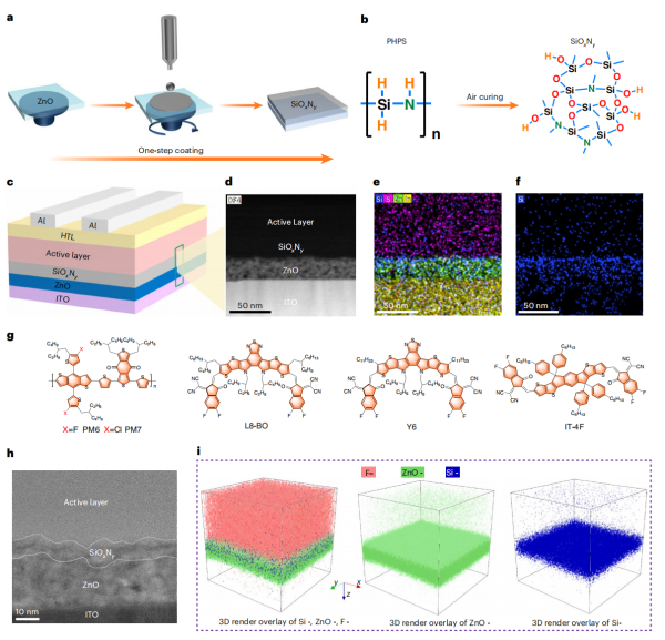 随着有机半导体材料的发展,有机薄膜太阳能电池的光电转化效率已超过20%。目前,高效率的有机太阳能电池均采用正置器件结构。与正置结构相对的倒置结构电池可使用高功函顶电极,与印刷工艺更兼容。同时,倒置结构电池避免使用吸湿性PEDOT:PSS,具有潜在的长期稳定性。尽管倒置有机太阳能电池具备上述优势,但它的光电转化效率仍落后于正置电池。因此,提升倒置电池的光电转化效率,对有机太阳能电池商业化应用至关重要。倒置有机太阳能电池常用的电子传输层材料包括金属氧化物。这些材料易产生表面缺陷,导致界面电荷复合,限制器件的光电转化效率。为解决上述问题,有研究开发了多种基于有机分子的界面钝化策略。但是,有机材料包括有机活性层本身,易在电子传输层表面被光催化降解,导致器件性能衰退。中国科学院苏州纳米技术与纳米仿生研究所研究员骆群、马昌期致力于倒置有机太阳能电池效率与稳定性的优化研究。本研究中,该团队联合芬兰埃博学术大学教授Ronald Österbacka,开发出原位转化的无机SiOxNy钝化层。该钝化层通过室温下将溶液法沉积的全氢聚硅氮烷(PHPS)进行原位转化获得。相比于常见的真空物理制备方法如原子层沉积,这一方法与湿法印刷工艺更兼容。进一步,分析表明,SiOxNy修饰层诱导非富勒烯受体在ZnO界面处富集,促进电荷提取。同时,PHPS的活性Si–H基团能够与ZnO形成Zn-O-Si键,并钝化ZnO表面缺陷。研究结合理论模拟发现,PHPS钝化ZnO缺陷后可以消除ZnO/活性层接触界面的n-型掺杂,消除界面少子的复合,提升电池的短路电流。两种效应的结合,使有效面积为5.77 mm2和100.17 mm2的倒置有机光伏的能量转化效率分别达到18.55%和18.12%。同时,第三方认证效率分别为18.49%和18.06%。更重要的是,SiOxNy薄层可以将有机光活性层与ZnO分隔,降低ZnO对有机半导体材料的光催化降解。研究显示,利用SiOxNy钝化的器件在连续白光照射下,T80寿命达24700小时。该研究提出了加工制备无机界面钝化层的新型可溶液法,为后续开发高稳定性倒置有机光伏提供了思路。同时,这一研究剖析了有机太阳能电池界面钝化提升器件短路电流的新机制。相关研究成果在线发表在《自然-光子学》(Nature Photonics)上。研究工作得到国家自然科学基金和中国科学院相关项目等的支持。论文链接SiOxNy钝化层的制备过程及在器件中的分布状况