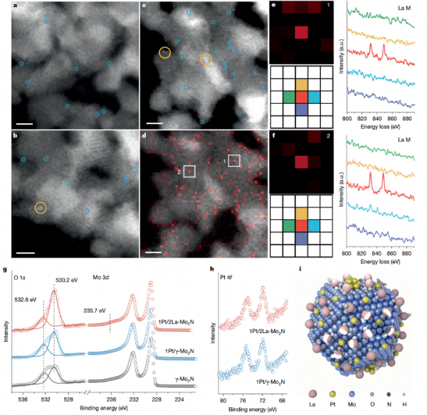 这一研究基于单原子分辨的低电压球差校正STEM成像和EELS化学成像分析,剖析了一系列加载不同惰性氧化物纳米覆盖层的Pt/Mo2N催化剂,揭示了La纳米覆盖层在提升催化剂稳定性方面的作用机制。其中,单原子精度的STEM-EELS分析解析了原子级分散La物种在催化剂表面的空间分布,提供了其化学价态的信息,为探讨La纳米覆盖层在Pt/γ-Mo2N界面保护中的结构基础提供了支持。该功能性化学成像技术可在单原子尺度上探究负载型催化剂表面物种的分散状态及电子结构,已成为推动催化剂设计与优化的重要研究手段。