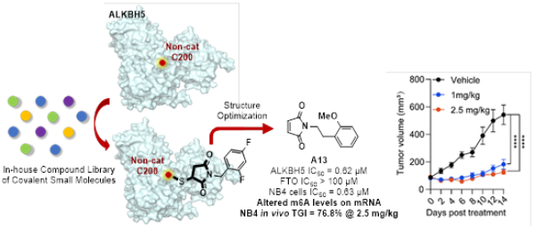 近期,中国科学院上海药物研究所柳红团队和杨财广团队,在ALKBH5小分子抑制剂发现方面取得进展。该团队发现了靶向ALKBH5 Cys200的共价抑制剂,开展了体外和体内抗肿瘤活性研究并通过化学生物学手段进行靶标验证,阐明了ALKBH5共价抑制剂发挥抗急性髓系白血病作用机制。