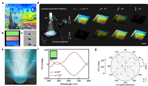 该研究发现,聚合物材料制备的微半球手性结构色材料即微半球,具有偏振依赖的手性光学响应特点,且其不对称因子达1.998。研究在理论和实验上证明,微半球的手性光学响应是来源于线偏振光入射时,线偏振光的两个分量即s分量和p分量之间经过多次全内反射产生π/2的相位差。微半球的结构色和图案可由简便、精确、高效的数字打印方法编程定制。同时,研究显示,微半球具有多重的偏振态和宽带可调的手性光学响应。研究利用微半球反射光偏振态的非均匀空间分布特点,通过调控入射光的偏振方向,实现了全彩结构色亮度的连续精确调控。微半球的色调和亮度对其形态和入射偏振方向非常敏感,因此可以通过设计微半球的排列和入射光的偏振角来编码不同信息。