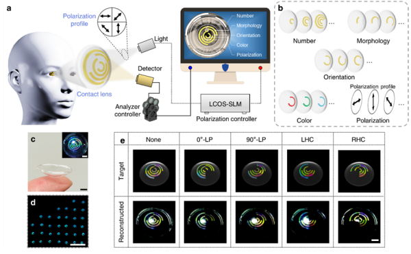 进一步,该研究模仿基于虹膜的身份识别系统,提出了将微半球与隐形眼镜集成来实现新型身份认证的策略。研究通过设计同心圆弧的数量、形貌、取向、颜色和偏振,实现了五重加密功能。当同心圆弧的数量、形貌、取向、颜色和偏振都是4种类型的情况下,即可实现232种编码容量。这表明,将微半球集成到隐形眼镜中,可以为提升个人身份信息安全开辟新途径,并可能通过整合不同的光学元件来实现人机交互。