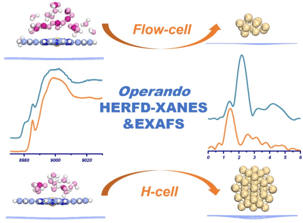 受限于常规表征方法的分辨率,此前的研究对CO2RR反应中传质的影响缺少量化评价数据。中国科学院上海高等研究院研究员宋飞团队结合工况扩展X射线吸收精细结构以及高能分辨率荧光检测X射线吸收光谱等谱学表征方法,实时监测模型催化剂在CO2RR过程中不同传质环境下催化剂表面的动态变化。研究发现,不同传质环境影响模型催化剂酞菁铜在CO2RR反应中Cu-N4的分离和Cu原子的团聚,从而决定不同的反应性能和选择性。研究结合同步辐射红外光谱和DFT理论计算,从反应动力学角度推演了催化剂的结构演化。研究还比较了CO2RR反应中所用器件的调控机制,可为后续反应器件的开发提供指导原则。