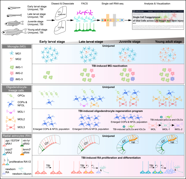 中国科学院脑科学与智能技术卓越创新中心何杰研究组运用单细胞转录组测序技术,建立了覆盖斑马鱼幼年早期、幼年晚期、青年、年轻成年4个年龄阶段的生理和创伤性脑损伤条件下中脑胶质细胞的转录组图谱,揭示了不同年龄大脑胶质细胞的异质性及其脑创伤响应特征(可视化网站:https://zebrafish.cn/Molecular-Atlas/scRNA-Glia)。