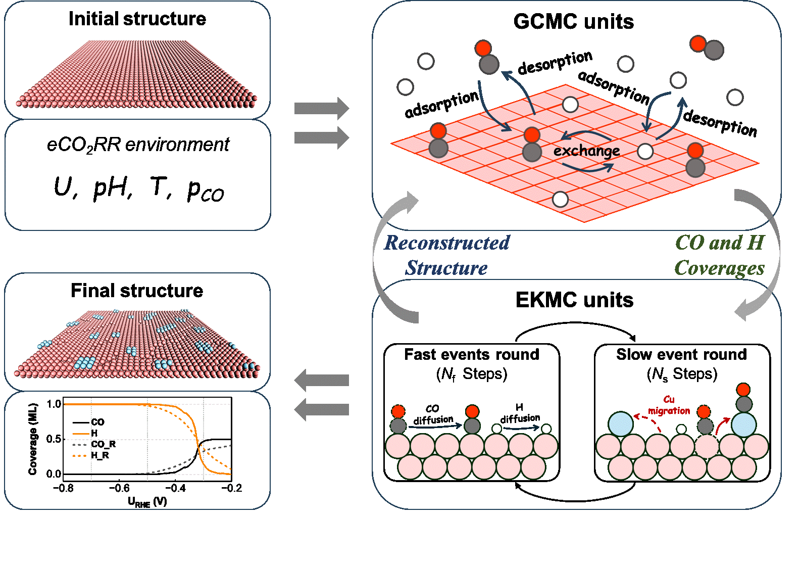 金属铜因具有将二氧化碳还原生成多碳产物的特性,引起学界的广泛关注。但电催化二氧化碳还原反应(eCO2RR)的产物选择性、铜基催化剂稳定性及能源效率等问题是制约其工业化应用的核心瓶颈。实验结果表明,铜基催化剂的表面形貌在电催化二氧化碳还原反应条件下易发生变化,影响其催化机理和反应活性。因此,深入解析催化剂在反应条件下的微观结构和形貌变化特性,并研究其对反应性能的影响,对催化剂理性设计与优化具有重要意义。近日,中国科学院上海高等研究院副研究员唐庆丽团队基于反应环境动力学蒙特卡洛模拟方法,结合电势依赖的巨正则蒙特卡洛模拟和密度泛函理论方法,对电催化二氧化碳还原反应的关键中间体诱导铜(100)表面原子级重构机理和重构表面反应性能的影响进行了系统研究。研究发现,诱导铜(100)局部一氧化碳高覆盖引起了表面原子跳出,并迁移、聚集形成小团簇。在模拟的条件下,重构表面在宽电位范围内展现出长达小时级的结构稳定性。同时,不同还原产物具有位点选择性。该研究建立了电催化环境下铜基催化剂结构重构模拟新方法,实现了宏观时间尺度(小时级)近万原子铜(100)表面结构重构过程模拟,并揭示了铜(100)表面原子级重构机制。上述成果有助于学界探讨反应驱动的结构演变对铜(100)表面催化eCO2RR的影响,并为通过调控原位活性位点的形成来提升产物选择性提供理论可能。相关研究成果以Reaction-Driven Varieties of Active Sites on Cu(100) in Electrochemical CO2 Reduction Reaction为题,发表在《ACS催化》(ACS Catalysis)上。研究工作得到国家自然科学基金委员会、科学技术部、上海市科学技术委员会等的支持。论文链接该研究建立的巨正则蒙特卡洛和反应环境动力学蒙特卡洛模拟方法迭代流程图