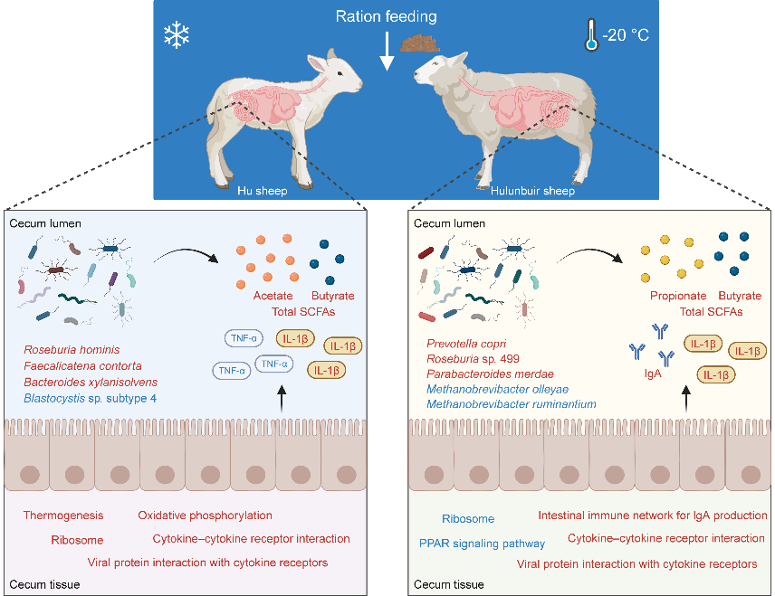 随着全球气候变化加剧,极端低温天气频发,畜牧业面临挑战。寒冷应激易导致牲畜生长缓慢、免疫力下降以及引发疾病甚至死亡。因此,如何提升牲畜的抗寒能力,成为保障畜牧业可持续发展的课题之一。针对上述问题,中国科学院西北生态环境资源研究院研究员杨果团队联合山东省农业科学院,以呼伦贝尔羊(耐寒型)与湖羊(低温敏感型)为研究对象,通过构建绵羊冷慢性应激模型并结合限饲控制,系统解析了盲肠微生物群落、代谢产物及宿主转录组的协同响应机制。研究发现,微生物代谢“分工”差异决定两种绵羊抗寒能力的不同。具体而言,呼伦贝尔羊为丙酸+丁酸双驱动,高效节能。其盲肠微生物多样性显著改变,产丙酸的普雷沃菌与产丁酸的罗斯氏菌丰度增加,甲烷菌减少,促进能量高效利用。丙酸作为葡萄糖前体,通过肝脏糖异生为全身供能,而丁酸能够强化肠道屏障功能并激活免疫应答,其浓度高于湖羊。同时,呼伦贝尔羊免疫指标分泌型IgA水平上升,炎症因子调控更精准,能量消耗减少,平均日增重未受低温影响。湖羊为乙酸代谢+组织产热,代价更高。其微生物群变化较小,乙酸浓度显著增加,需依赖组织产热维持体温,导致能量损耗较大。同时,湖羊促炎因子IL-1β升高,抗炎因子IL-10小幅上升,免疫平衡压力大,平均日增重显著下降。该研究揭示了湖羊依赖微生物-宿主互作增强产热,而呼伦贝尔羊通过微生物功能重塑实现“节能型”适应的不同响应机制,为家畜环境适应性研究提供了新模式,并为开发“微生态抗寒制剂”奠定了理论基础。下一步,研究将扩大样本规模,以验证丙酸、丁酸及其产生菌在绵羊抗寒中的因果关系,并探讨通过饲料添加剂或菌群移植定向优化绵羊肠道微生态方法。近期,相关研究成果以Enhanced propionate and butyrate metabolism in cecal microbiota contributes to cold-stress adaptation in sheep为题,发表在《微生物组》(Microbiome)上。研究工作得到中国科学院、甘肃省科学技术厅等的支持。湖羊和呼伦贝尔羊盲肠微生物代谢对冷应激的不同响应机制