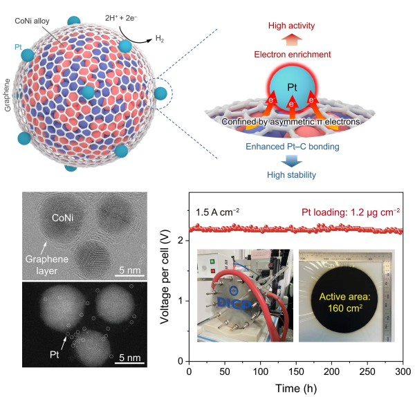 近日,中国科学院大连化学物理研究所能源催化转化全国重点实验室能源与环境小分子催化研究中心研究员邓德会和于良团队与中国科学技术大学教授路军岭团队、大连化物所高效电解水制氢研究组研究员俞红梅团队合作,发现铠甲催化剂表面富集的不对称π电子具有独特的限域效应,可同时提升表面限域铂(Pt)原子的活性和稳定性。基于此,合作团队设计合成了高活性、高稳定性的电解水制氢催化剂,并组装了千瓦级质子交换膜电解槽,实现了超低Pt载量、工业大电流密度下的高效酸性电解水制氢。