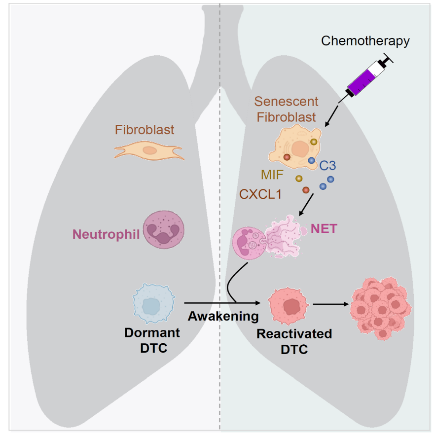 化疗等治疗手段通常对原发肿瘤有显著疗效,但治疗后肿瘤常在远端复发。此前,有研究表明在原发肿瘤形成早期,即临床无法检测到明显的转移灶之前,癌细胞已经播散到远端器官,并处于不增殖、不死亡的休眠状态,进而逃避系统治疗继续存活。然而,休眠的播散癌细胞在何种情况下恢复增殖状态并在治疗后转移复发尚不明晰。