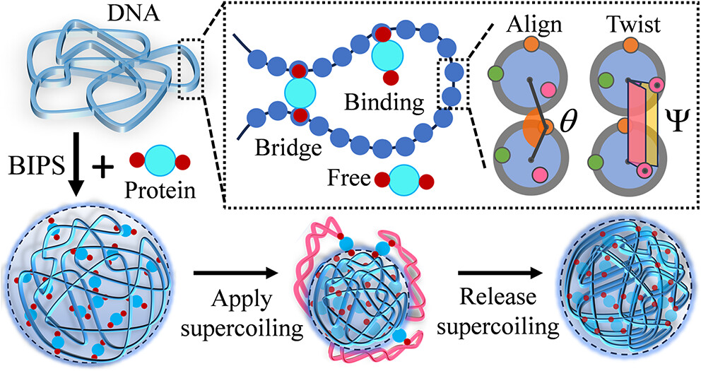 在生物大分子体系中,电荷作用、氢键、疏水作用、π–π与阳离子—π等非共价相互作用,决定蛋白与核酸如何识别、组装并形成生物分子凝聚体。对染色质相关凝聚体而言,这些“相互作用网络”之外,还存在一个关键自由度——DNA在转录与拓扑异构酶调控下不断积累/释放扭转载荷,形成DNA超螺旋。超螺旋不仅可能改变蛋白—DNA的结合几何与多价桥联方式,更可能直接重塑凝聚体的内部结构与尺寸演化路径。
