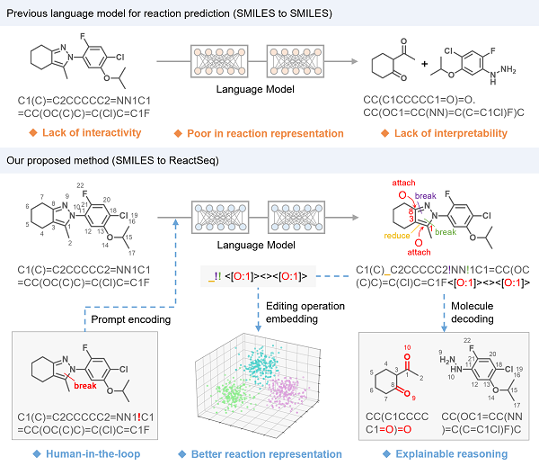 近年来,为提升CLMs在特定任务中的表现,有研究设计了一些新的分子线性注释。然而,这些语言都是为了描述化学分子的静态结构,无法明确描述化学反应过程中分子中原子和键的变化过程。这限制了语言模型在化学反应预测和表示中的应用。目前用于化学反应预测的语言模型包括正向和反向合成预测,通常直接将产物和反应物的线性表示相互转换,但在可解释性与交互性方面存在不足。此外,尽管预训练语言模型在多种序列数据的表示学习方面表现出色,但其在化学反应表示方面的进展相对有限。