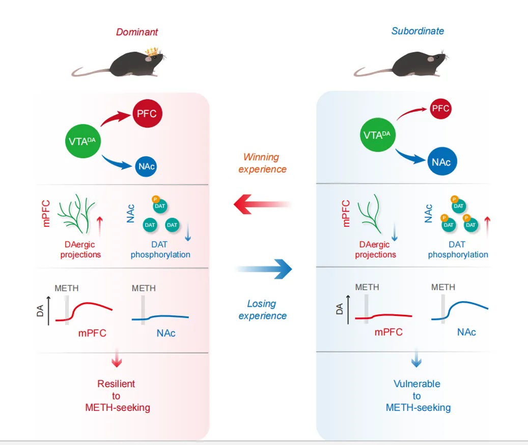 社会等级通过影响“中脑-皮质”和“中脑-边缘”多巴胺通路,调控甲基苯丙胺成瘾行为