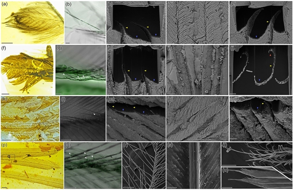 针对上述问题,中国科学院动物研究所研究员白明团队联合国家自然博物馆、中国科学院南京地质古生物研究所、中国科学院古脊椎动物与古人类研究所、沈阳师范大学及首都师范大学等单位的科研人员,对距今约9900万年前的5块晚白垩世缅甸羽毛琥珀进行研究。该研究构建了针对羽毛琥珀微纳结构原位暴露和三维形态获取分析技术体系,并通过使用片溶法对羽毛化石表面进行局部处理,将羽小枝及其黑素体原位暴露,且利用激光共聚焦显微镜与高分辨率扫描电镜分别获得三维结构信息和羽小枝及其黑素体的微纳尺度超微结构信息。同时,研究利用扫描电镜的聚焦离子束技术对羽小枝进行原位切割,获得了羽小枝横截面的三维超微结构。