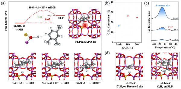 该研究发现,分子筛内酸强度较弱的Brønsted酸位点可以将H+转移到邻近的碳物种上,可使Si-O--Al为路易斯碱、碳正离子为路易斯酸;空间邻近的路易斯酸碱位点之间受到静电吸引作用和空间位阻的排斥作用,形成受阻路易斯酸碱对。
