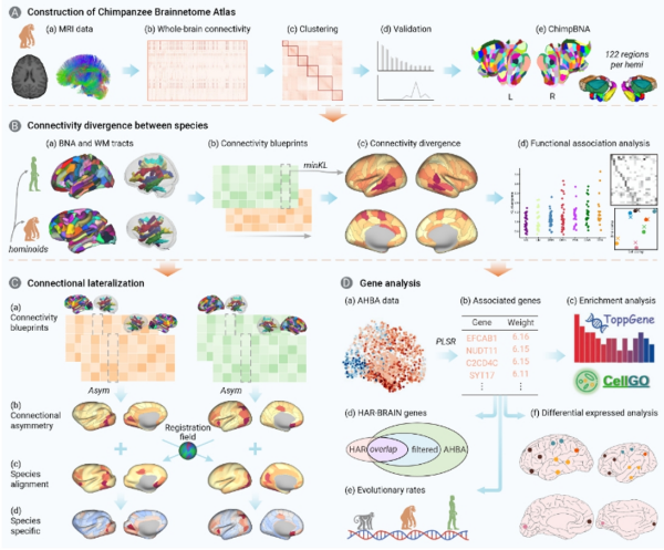 近期,中国科学院自动化研究所脑网络组研究团队联合国内外科研机构,发布了迄今为止最精细的黑猩猩脑图谱——黑猩猩脑网络组图谱(ChimpBNA)。这一成果为比较神经科学研究提供了重要工具,并为探讨人脑演化提供了新视角。黑猩猩是人类最亲近的灵长类亲戚之一,与人类共享约600万至800万年前的共同祖先。尽管黑猩猩的大脑体积只有人类的三分之一左右,但它们在神经解剖学和认知功能方面展现出较多相似之处,包括社会行为、工作记忆和工具使用。这些相似性使黑猩猩成为研究人类演化的关键比较对象。当前,跨物种神经科学研究面临的主要挑战是缺乏具有生物学意义的标准化脑部参考系统。以往的比较分析尝试通过细胞构筑、髓鞘配布、宏观解剖、功能连接模式、功能激活或这些特征的组合来定义物种间的同源大脑皮层区域,但由于构建这些图谱所使用的模态和尺度不一致,跨物种的直接比较十分困难。针对上述难题,该研究基于此前提出的利用脑连接信息绘制脑图谱的基本思想,绘制出黑猩猩脑网络组图谱。利用这一图谱,研究重建了同源白质纤维束,为人类和黑猩猩构建了连接指纹图,并为在亚区级别进行细粒度的跨物种脑连接差异分析以及识别相关的白质束提供了可能。进一步,研究检查了每个物种脑连接模式的广泛侧化,并将这些模式与物种间连接性差异的关系对齐到一个共同的空间中,识别了与物种间连接性差异相关的基因及其表达模式。研究发现,黑猩猩脑网络组图谱揭示了与人类大脑皮层显著不同的连接模式,特别是在外侧颞叶和背外侧前额叶皮层。这些差异与大脑皮层扩张的模式不同,表明大脑皮层演化中的连接性变化可能比之前认为的更为复杂和微妙。同时,研究显示,物种间连接性不对称的区域,其形成可能与演化分歧有关。这些连接性差异区域高表达的基因,富集在对皮层投射回路和突触形成重要的细胞类型中,表明这些基因在神经回路的发展、功能和演化中发挥了重要作用。这一黑猩猩脑网络组图谱呈现了黑猩猩脑部的详细地图,将成为神经科学研究的重要资源,有望为揭示人类大脑独特性提供新线索。该研究通过将神经影像数据与遗传数据相结合,为人类认知能力演化的物种特异性差异提供了潜在的基因表达相关性。后续,研究团队将专注于建立更准确的跨物种同源映射,以进一步增强跨物种脑图谱在理解神经系统演化中的实用性。相关研究成果发表在《创新》(The Innovation)上。研究工作得到科技创新2030-“脑科学与类脑研究”重大项目和国家自然科学基金等的支持。为促进全球科研人员的合作研究,该团队已公开黑猩猩脑网络组图谱的表面和体积数据文件以及支持所有图表的源数据。论文链接开源数据研究框架图从黑猩猩到人类的脑演化之旅