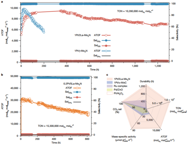 实验数据显示,在甲醇重整制氢反应中,新型Pt/La-Mo2N催化剂展现出超过1000小时的稳定性而未有明显失活。同时,该催化剂可以保持超高活性和选择性,实现了超过1500万的超高催化转化数,创造了目前甲醇-水制氢催化反应的最高纪录。