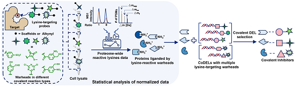 中国科学院上海药物研究所陆晓杰课题组联合复旦大学周璐课题组、浙江大学医学院附属第二医院肿瘤研究所/浙江大学转化医学研究院孙毅课题组,将基于活性的蛋白质组分析(ABPP)数据与共价DNA编码化合物库(CoDEL)技术相结合,利用赖氨酸反应性蛋白质组学数据指导CoDEL筛选,发现了结构新颖、反应机制多样的赖氨酸靶向共价抑制剂。这一方法不仅扩展了共价靶向策略的靶标适用范围,而且为共价抑制剂的理性设计提供了新思路。